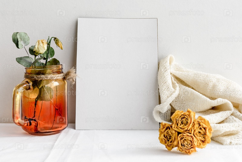 Пустая белая открытка и засушенные цветы в вазе на белом фоне. Романтический фон для приглашения