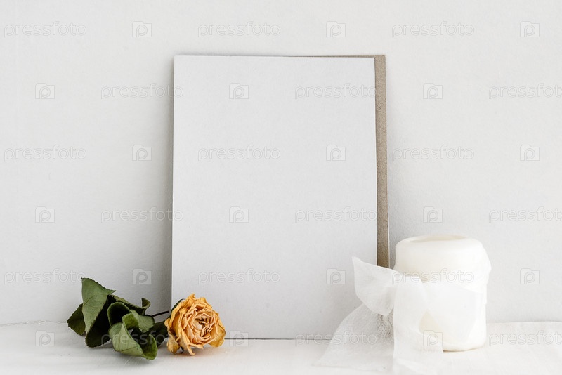 Пустая белая поздравительная открытка, свеча и жемчужное ожерелье на белой предпосылке. Романтический фон для приглашения
