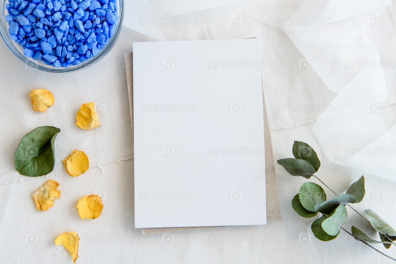 Летняя свадебная сцена макета канцелярских товаров. Пустая вертикальная открытка, конверт из крафт-бумаги и оливковые ветви, изолированные на белом фоне стола. Женственная средиземноморская квартира, вид сверху
