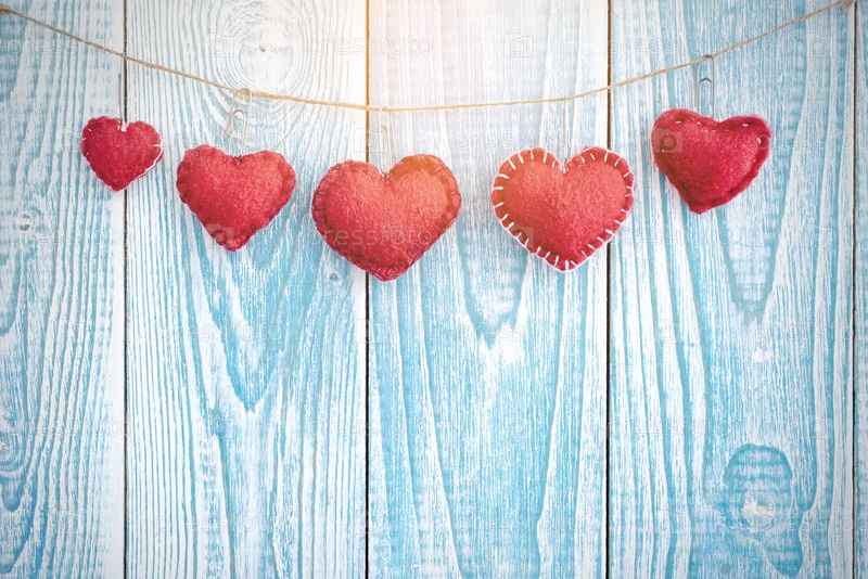 Красивый синий деревянный фон с красными сердечками. Лучшая открытка ко Дню святого Валентина