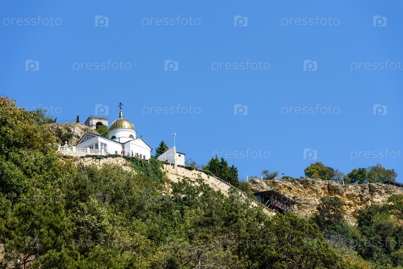 Крым, Балаклава, 15 сентября 2019 г.: монастырь Святого Георгия и пляж Яшма, вид сверху