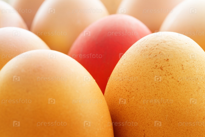 Яйца в магазине с одним красным яйцом. Крупный план. тонирование