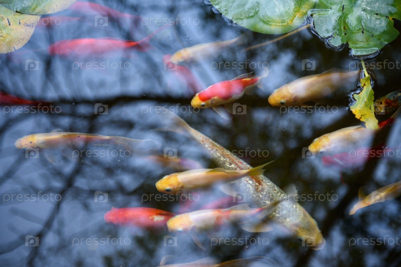 Бассейн с золотой и красной рыбой – вид через воду