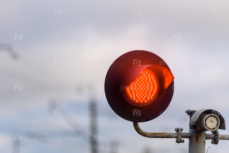 Красный свет на светофоре на железнодорожном переезде. Крупным планом