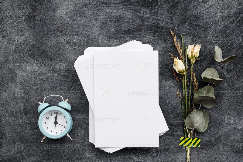 Модный фон канцелярских товаров на черном - блокнот, наклейки, будильник и цветы