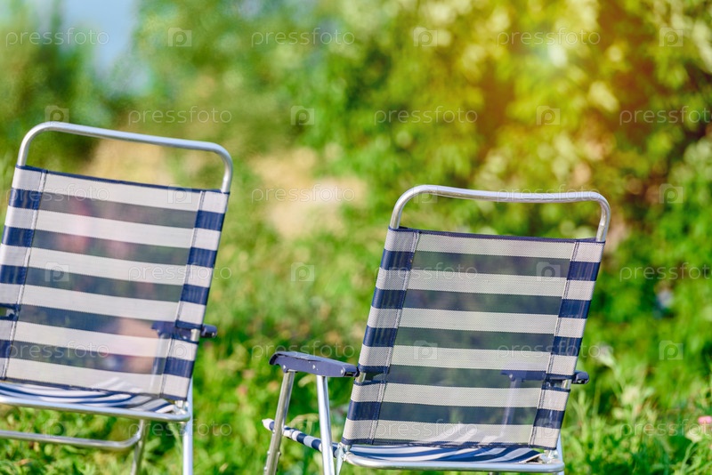 Два складных полосатых стула для отдыха на природе
