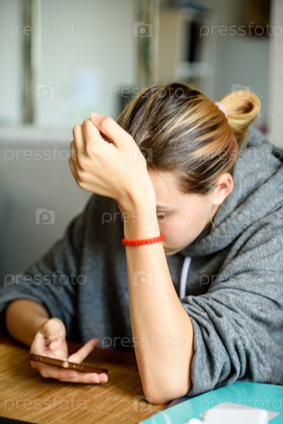 Молодая девушка сидит за столом с телефоном в руке