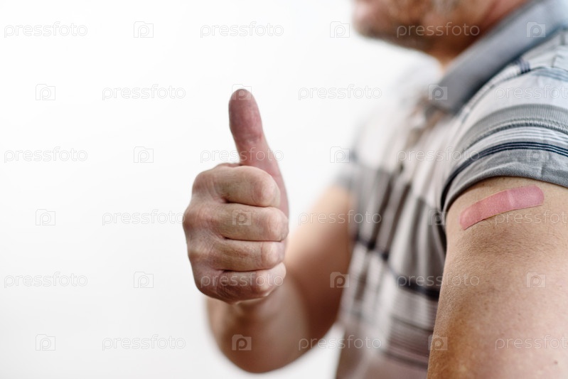 Счастливый мужчина после вакцинации поднимает большой палец вверх