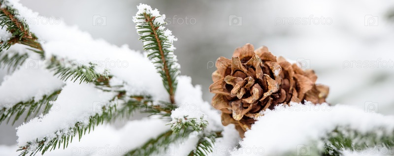 Крупный план еловой ветки с шишками зимой. Красивый зимний вид