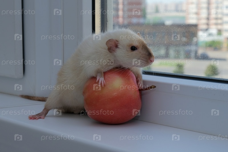 Забавная крыса обхватила лапками красное яблоко