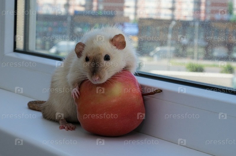 Крыса бежевого окраса с красным яблоком на окне