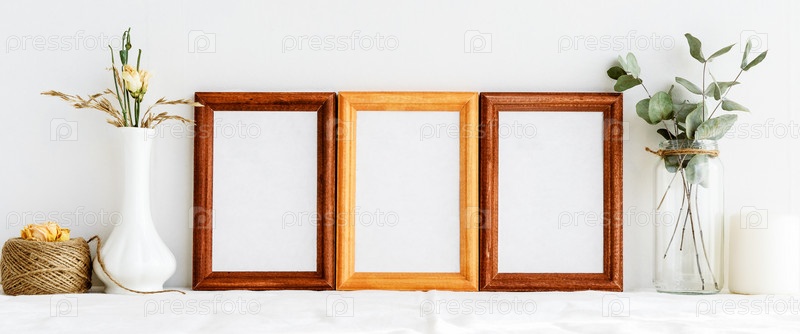 Деревянная фоторамка и сухие белые розы в вазе на белом фоне. Минималистичная, нежная летняя планировка. Заготовка для открытки. Интерьер для дизайна. Панорама