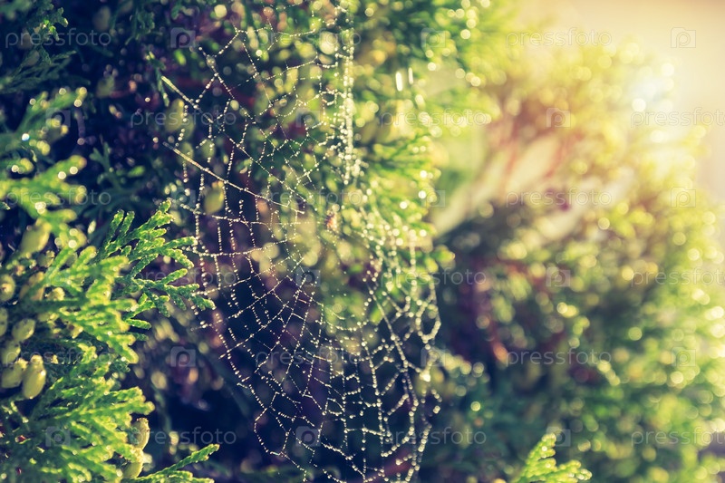Сетчатая паутина на зеленом дереве и размытом солнечном фоне. Природа-фон и текстура