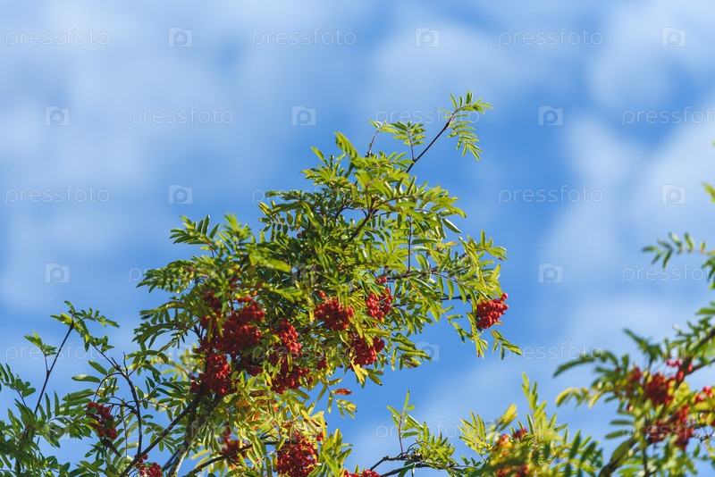 Ветка с красными осенними ягодами Роуэн. Естественный осенний фон