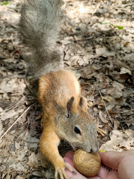 Бельчонок с руки схватил зубами грецкий орех в скорлупе