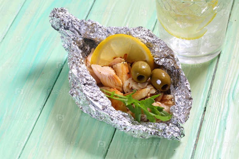Форель с лимоном и оливками в фольге. уличная забегаловка