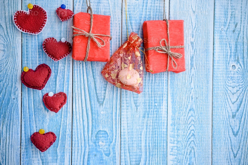 Красивый синий деревянный фон с красными сердечками. Лучшая открытка ко Дню святого Валентина