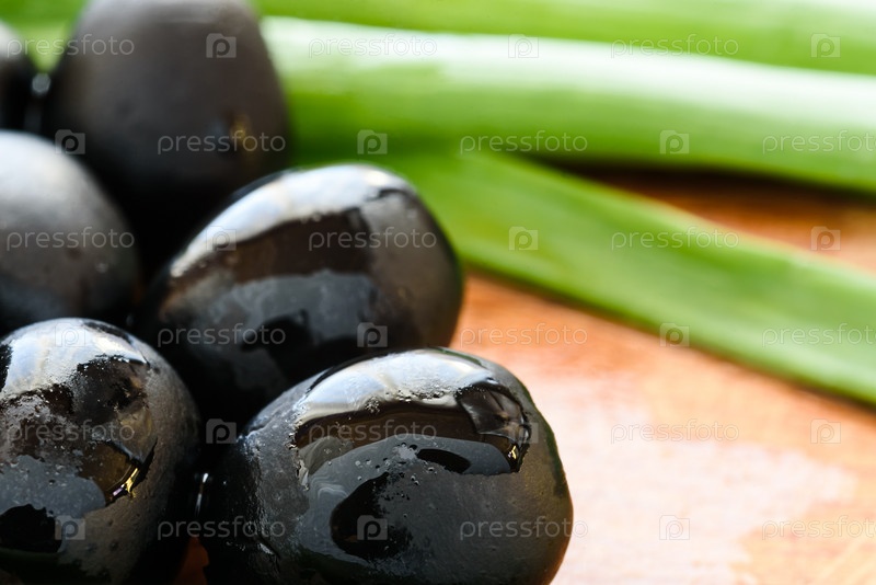 Маринованные черные оливки на деревянном фоне