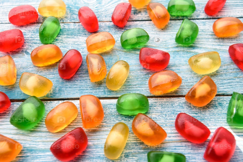 Красочные желейные конфеты, разбросанные по синему деревянному фону