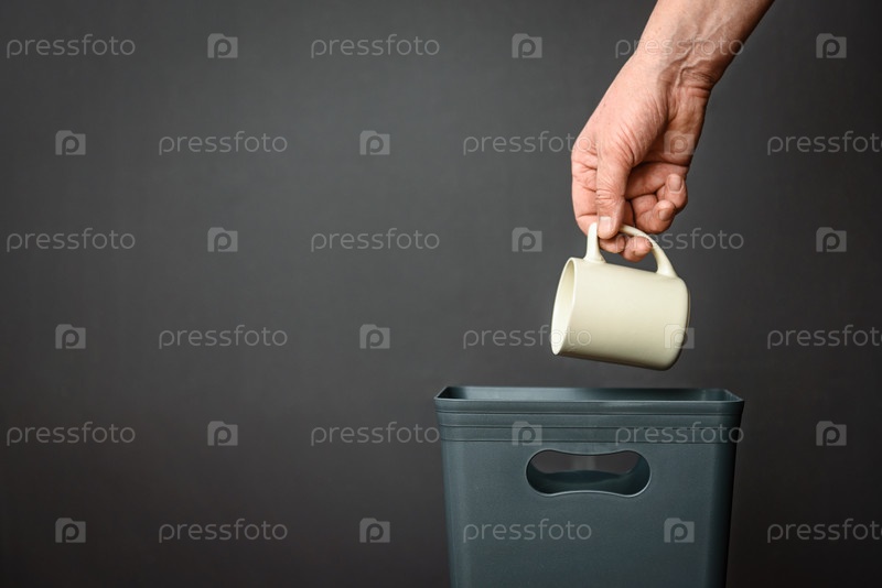 Белую фарфоровую чашку бросают в ведро для переработки и переработки