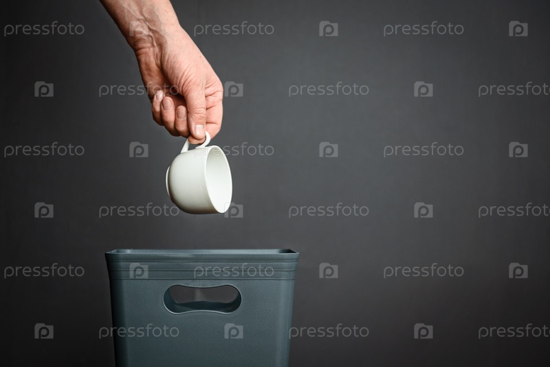 Белую фарфоровую чашку бросают в ведро