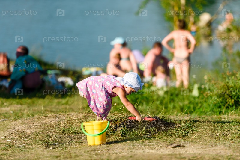Россия, Санкт-Петербург, 24 июня 2020 г.: Маленькая девочка в розовом платье играет в песке на берегу озера