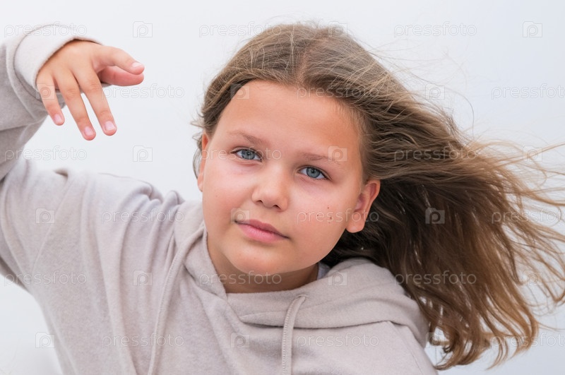 Девочка 10 лет с длинными волосами в серой кофте с поднятой кистью руки