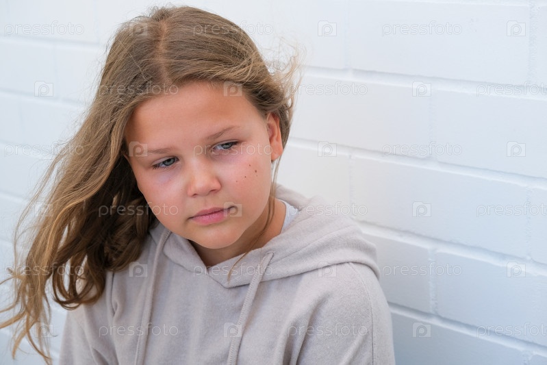 Девочка школьница с задумчивым взглядом на фоне белой кирпичной стены