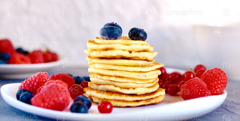 Блины на белой тарелке, выборочный фокус