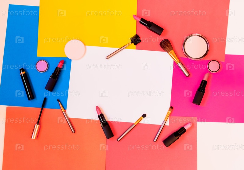 Косметика для макияжа и кисти на цветном бумажном фоне