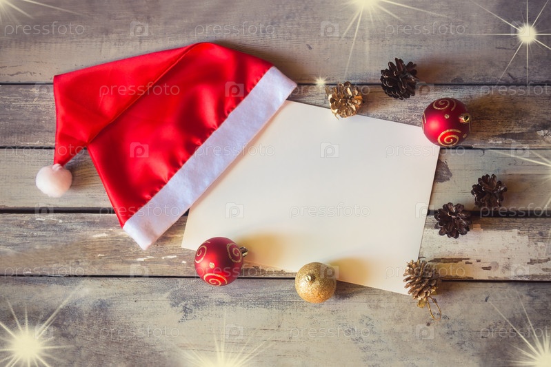 Рождественская открытка со шляпой Санты и рождественскими украшениями на деревянном фоне