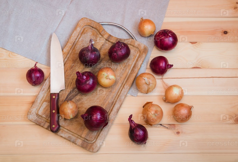 Лук на разделочной доске и рядом на деревянном фоне. Вид сверху