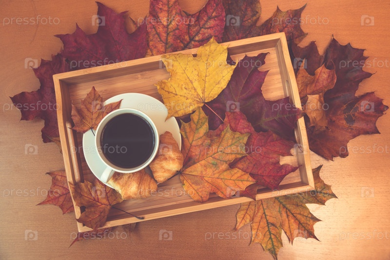 Чашка кофе, круассаны и осенние кленовые листья на деревянном столе