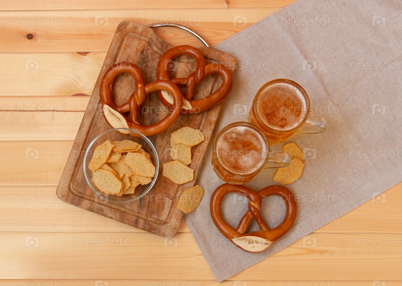 Пивные кружки, картофельные чипсы и крендели с солью на деревянном столе. Вид сверху