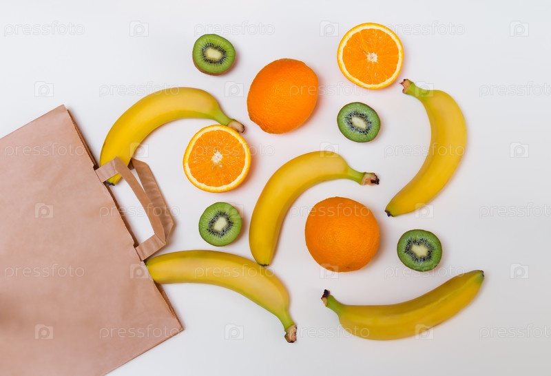 Фрукты раскатаны из бумажного пакета на пастельный фон
