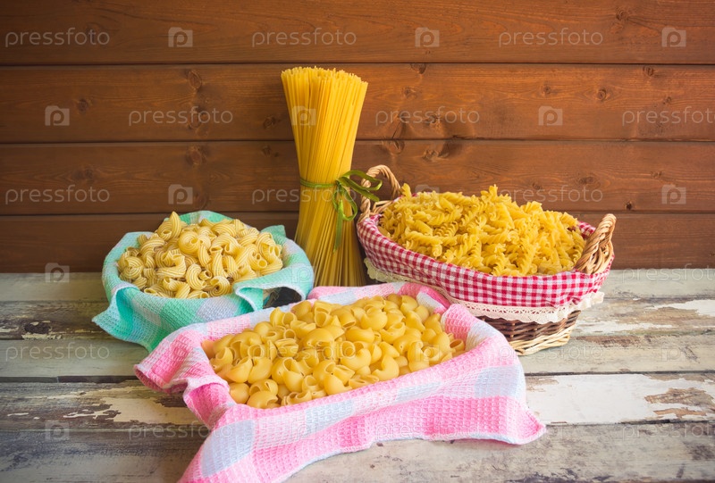 Различные виды сырых макарон на деревянном столе