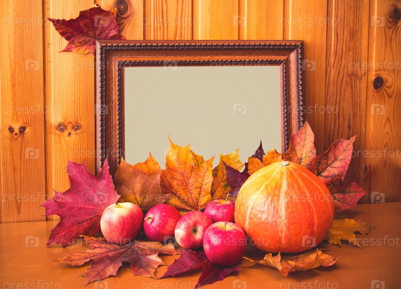 Яблоки, тыква, кленовые листья и фоторамка. Осенняя концепция