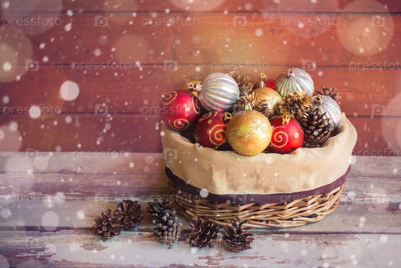Рождественские украшения и сосновые шишки в корзине. Селективный фокус