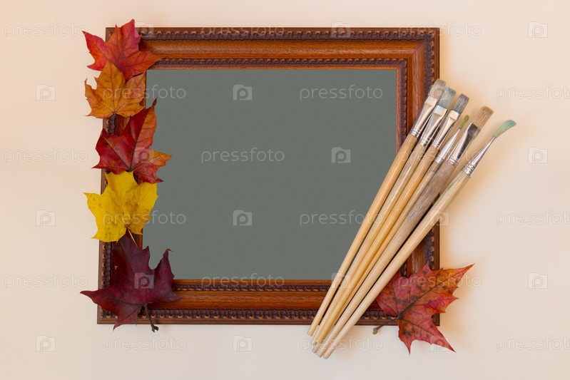 Рамка для фотографий, кисти и красочные осенние листья на пастельном фоне