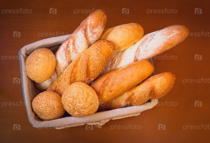 Свежий пшеничный хлеб в корзине на деревянной поверхности. Вид сверху