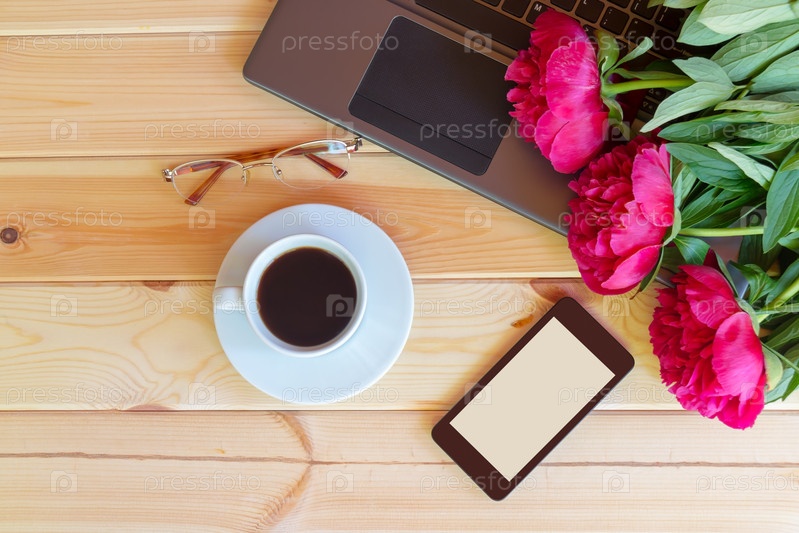 Кофейная чашка, клавиатура ноутбука, смартфон, очки и красные цветы пиона на деревянном столе. Вид сверху, пространство для копирования