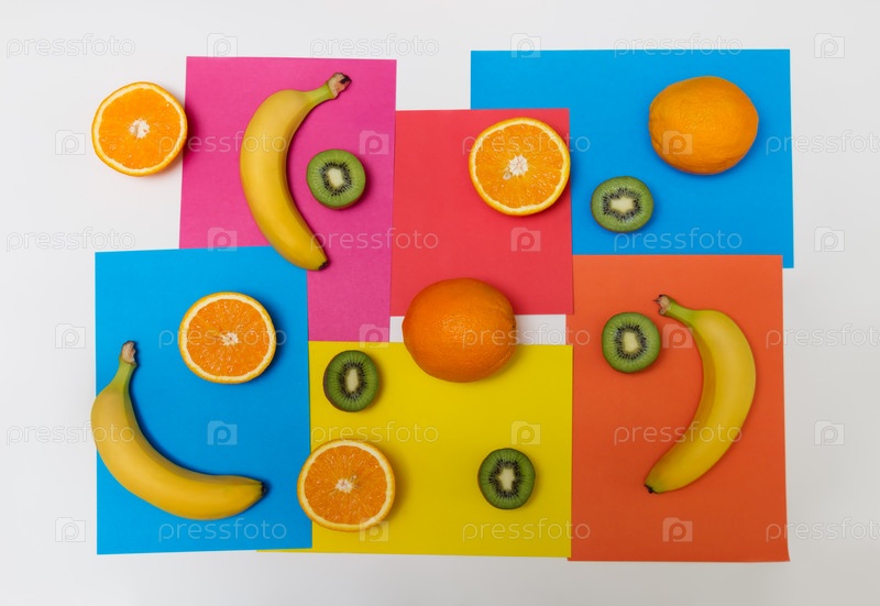 Пищевой узор из апельсинов, киви и бананов на красочном фоне