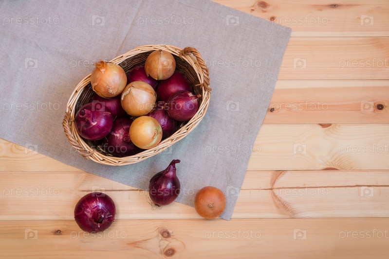Лук в корзине на деревянных фоне. Вид сверху. Копировать пространство
