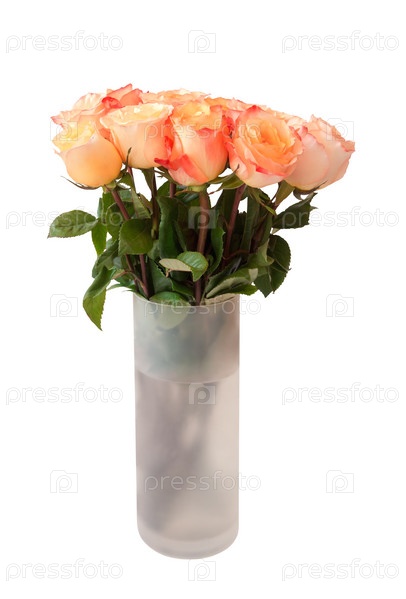 Букет розовых роз в стеклянной вазе, изолированной на белом
