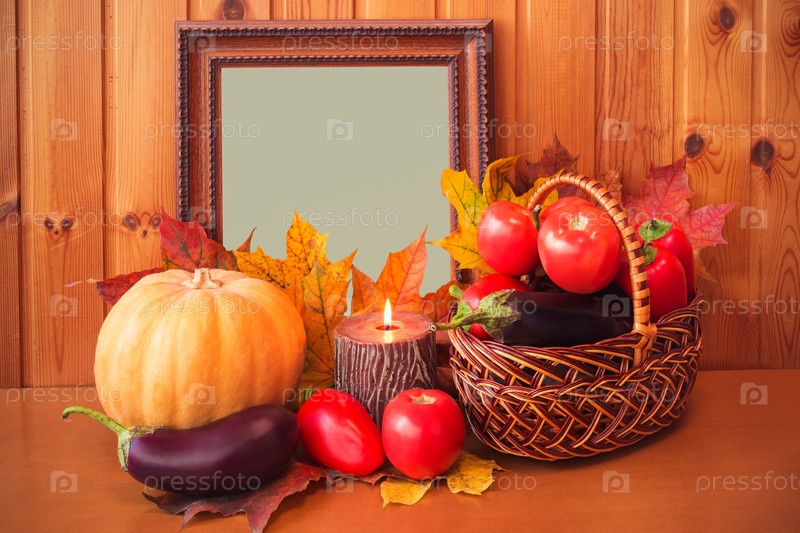 Свежие овощи, свеча и фоторамка с осенними кленовыми листьями