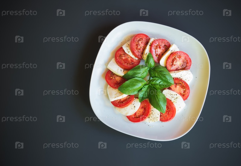 Салат Капрезе с сыром моцарелла, помидорами и зеленым базиликом. Вид сверху, пространство для копирования
