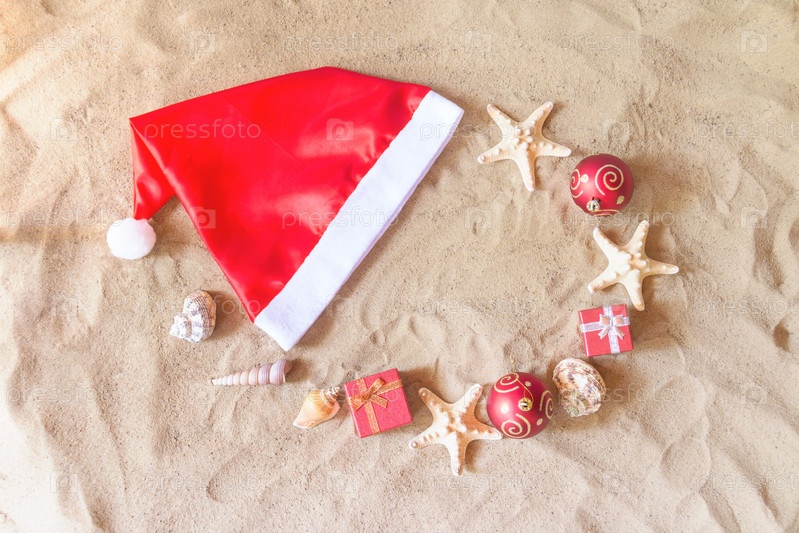 Шляпа Санта-Клауса, елочные шары, подарки, ракушки и морские звезды на песчаном пляже