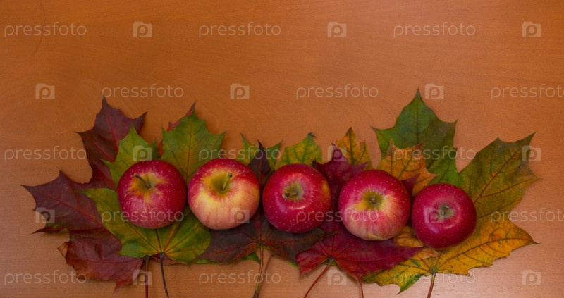 Граница разноцветных кленовых листьев и яблок на деревянном фоне