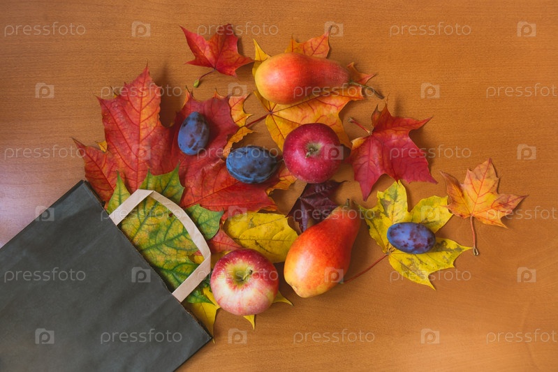 Красочные осенние кленовые листья и фрукты в коричневом бумажном пакете. Концепция продажи и покупок
