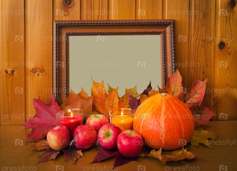 Яблоки, свечи, тыква и рамка для фотографий на деревянном столе